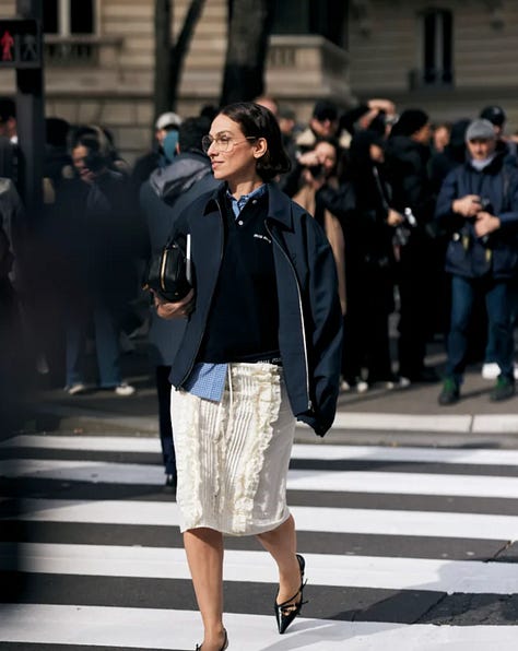I love the unexpected coolness of pairing a skirt with something traditionally masculine – a crisp button-down, a classic crewneck sweater, even a workwear jacket. It's about that juxtaposition.